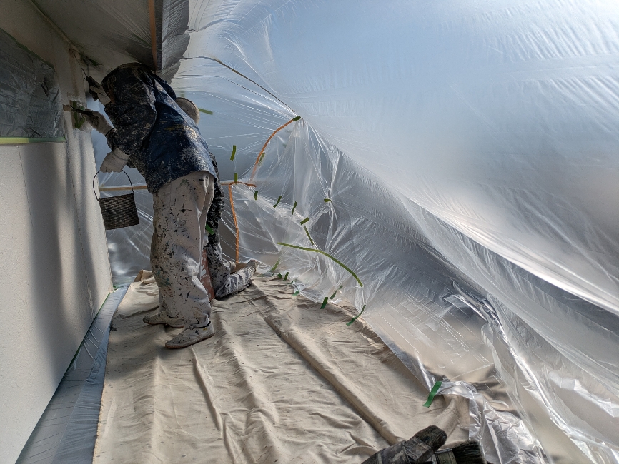 そこで作業範囲全体を養生ビニールで覆ってみました。これで塗料が飛ばされることもなく安心安全に作業ができます。